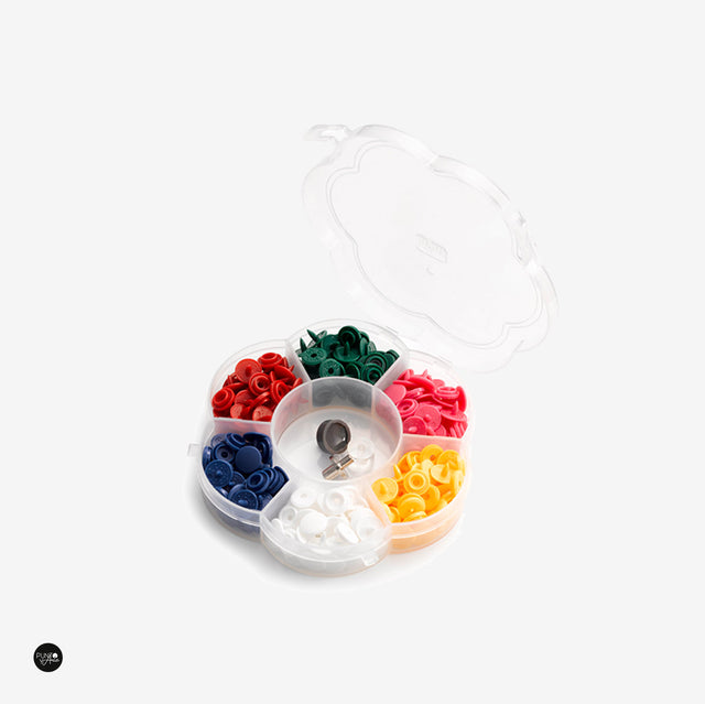 - Variedad de Colores: El set incluye 72 botones Snaps Mini distribuidos en una paleta de colores versátil y atractiva, con 12 unidades de cada uno de los siguientes colores: blanco, amarillo, fucsia, rojo, verde oscuro y azul tinta.