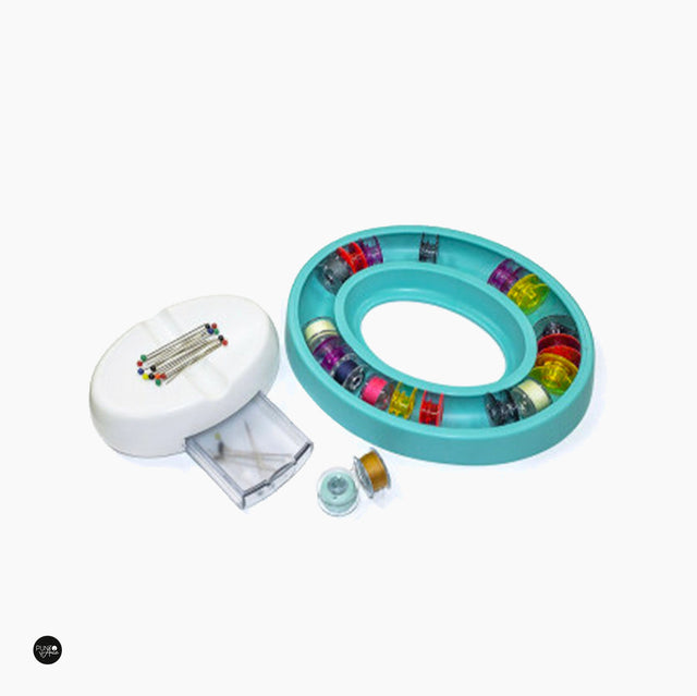 Espacio Dedicado para Canillas de Hilo: Rodeando el cojín magnético, encontrarás un espacio de almacenamiento diseñado específicamente para hasta 30 canillas de hilo para máquina de coser. Esta área, realizada en plástico flexible de color verde menta, permite un acceso rápido y fácil a tus canillas, facilitando el cambio de hilo y manteniendo tus canillas organizadas y libres de enredos.