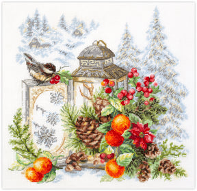 Captura la esencia de la temporada más fría con el Kit de Punto de Cruz Magic Needle - El Aroma del Invierno. Este kit te permite bordar una escena invernal que irradia calidez, con elementos naturales como piñas, acebo y bayas rojas, un pájaro acurrucado contra el frío y una linterna clásica, todo envuelto en un suave paisaje nevado.