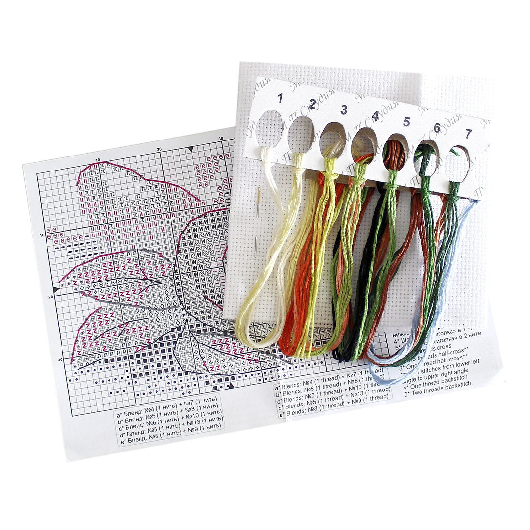 Aguja, gráfico en color e instrucciones en 8 idiomas.