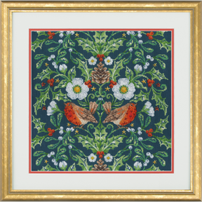 Diseño exclusivo inspirado en el estilo artístico de William Morris y los patrones de las Artes y Oficios. Este hermoso kit presenta petirrojos, flores de Navidad, acebo, bayas y follaje invernal. Perfecto para los amantes del bordado y el arte clásico.