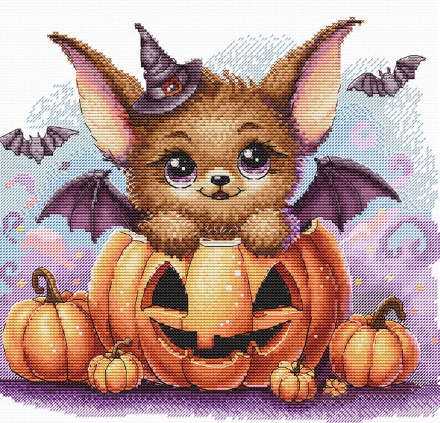 ¡Sumérgete en la magia de Halloween con este encantador kit de punto de cruz de AVA! El diseño muestra un adorable personaje con alas de murciélago, orejas enormes y un sombrero de bruja, posando sobre una calabaza tallada con una gran sonrisa. Un proyecto perfecto para quienes adoran lo tierno y lo tenebroso al mismo tiempo.