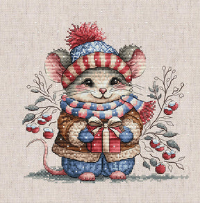 El kit de punto de cruz "Ratoncito con Bufanda" de Punto y Arte (AVA) presenta una tierna imagen de un ratoncito abrigado con un gorro, bufanda y guantes, sosteniendo un pequeño regalo. Este encantador diseño es perfecto para la temporada invernal, reflejando calidez y dulzura.