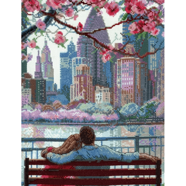 Admira la belleza de Nueva York en primavera con el kit de punto de cruz "Blooming New York" A1015 de Aine Collection. Este diseño romántico muestra a una pareja disfrutando de una vista serena de la ciudad en plena floración, combinando la arquitectura urbana con la delicadeza de los cerezos en flor.