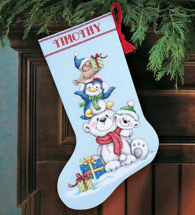 Dos osos polares, un pingüino y un pajarito trabajan juntos para difundir un poco de alegría navideña en este calcetín Dimensions Stack of Critters en punto de cruz contado. Tamaño: 16" de largo. Diseñado por Makiko. Ilustración de Makiko. Cortesía de www.image-source.co.uk. El kit de punto de cruz contado contiene: • Hilo de algodón preclasificado• Hilo de lana • Aida azul claro de 14 hilos• Fieltro • Aguja • Instrucciones fáciles con un alfabeto.
