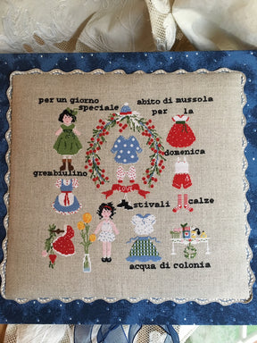 "Agua de colonia" es un esquema de punto de cruz contado en color que representa muñecas y vestidos.