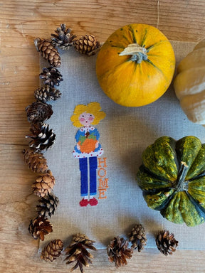"Niña Octubre" es un esquema de punto de cruz contado en color que representa una niña con una calabaza y que sirve para decorar tus toallas de cocina y manteles individuales.