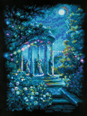 El kit de punto de cruz "Encanto de Medianoche", artículo #2216 de Riolis, te invita a crear una atmósfera nocturna repleta de misterio y belleza. Este diseño artístico presenta una escena etérea de un gazebo iluminado por la luz de la luna, rodeado por la floreciente flora de medianoche, bajo un cielo estrellado.