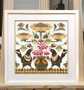 Disfruta del encanto del arte tradicional con el kit de punto de cruz OVEN 1691 – Magpies. Este diseño inspirado en motivos folclóricos muestra dos urracas frente a un jarrón floral, rodeadas de mariposas y girasoles. Una composición simétrica y elegante que combina tonos cálidos y naturales con detalles decorativos únicos.