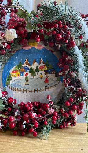 "Patines y cristales de nieve" es un esquema de punto de cruz contado en color que representa una escena de invierno