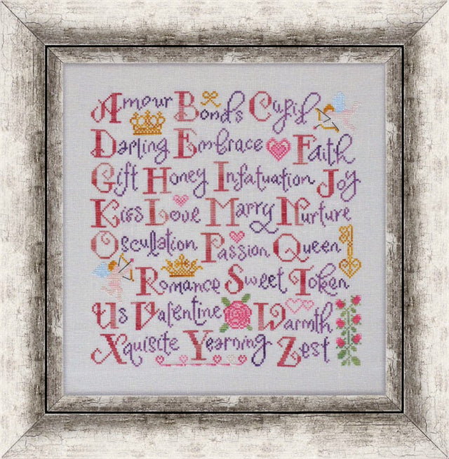 Cupidos, corazones y motivos de San Valentín en este patrón de punto de cruz de Cottage Garden Samplings. El modelo se bordó en lino de 32 hilos, ¡pero puedes usar cualquier tejido que elijas!