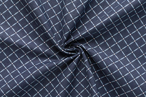 El tejido mostrado tiene un diseño geométrico con un patrón de líneas diagonales formando rombos y pequeños puntos en cada intersección. La base del tejido parece ser de un tono azul más oscuro, posiblemente acercándose al "azul atlántico profundo" mencionado en la descripción, con puntos de un tono más claro y contrastante.