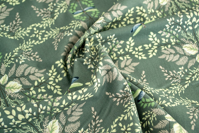 La tela "Natural Beauty" de la marca Gütermann presenta un diseño encantador y detallado que refleja la belleza de la naturaleza. Con un fondo verde oliva, este tejido está adornado con patrones de hojas, flores y libélulas, que transmiten una sensación de serenidad y gracia.