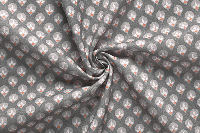 La tela que se muestra en la imagen presenta un diseño moderno y repetitivo de lo que parece ser un motivo de hoja o de capullo en tonos grises y blancos. Las formas geométricas y la paleta de colores monocromáticos le dan un toque contemporáneo y versátil.