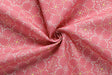 La tela que se muestra en la imagen presenta un diseño delicado de pequeñas flores y puntos blancos sobre un fondo rosa. El patrón es sutil y da la sensación de frescura y ligereza, siendo adecuado para una variedad de aplicaciones, desde ropa hasta artículos de hogar.