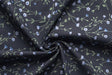 La tela mostrada en la imagen presenta un diseño floral delicado y sutil en un fondo oscuro. Las pequeñas flores y hojas en tonos de azul claro, blanco y verde se dispersan de manera equilibrada a lo largo del tejido, dando una sensación de serenidad y elegancia.