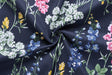 La tela presentada en esta imagen tiene un fondo azul oscuro, casi antracita, que contrasta maravillosamente con un estampado floral brillante y vívido. Las flores y las hojas en tonos de rosa, azul, blanco, verde y amarillo destacan con vivacidad contra el fondo oscuro, creando una sensación de elegancia y sofisticación.
