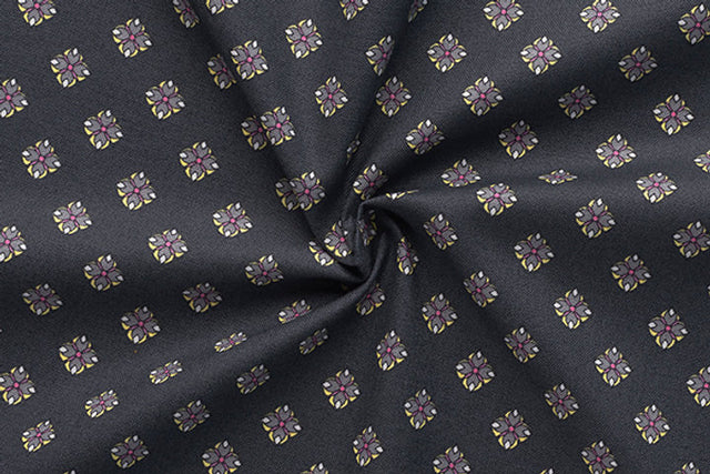 La tela presentada tiene un fondo oscuro, que podría corresponder al tono "antracita expresivo" mencionado en la descripción. Sobre este fondo oscuro, hay un diseño repetitivo de pequeñas flores simétricas. Estas flores tienen tonalidades que incluyen rosa, que podría ser el "rosa delicado" mencionado, y otros colores suaves y pastel.