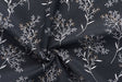 El tejido presentado muestra un patrón botánico de ramas con hojas y florecillas. Estas formas botánicas están distribuidas uniformemente sobre un fondo oscuro, posiblemente cercano al tono "antracita" mencionado en la descripción. Las hojas y flores están delineadas en un color blanco o muy claro, mientras que algunos detalles en tonos dorados o bronces dan un toque de contraste y elegancia al diseño.