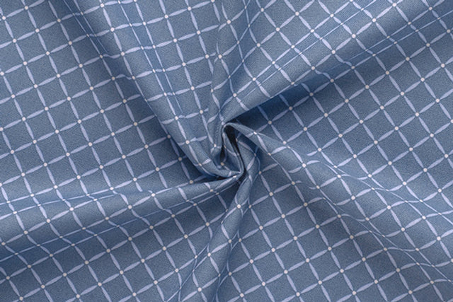 El tejido presenta un diseño geométrico en tonos de azul pastel con una red de líneas diagonales y puntos blancos en las intersecciones. Este color suave y fresco evoca tranquilidad y serenidad.