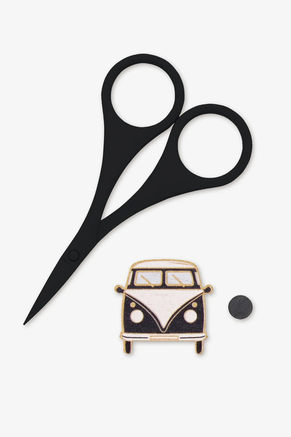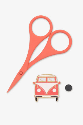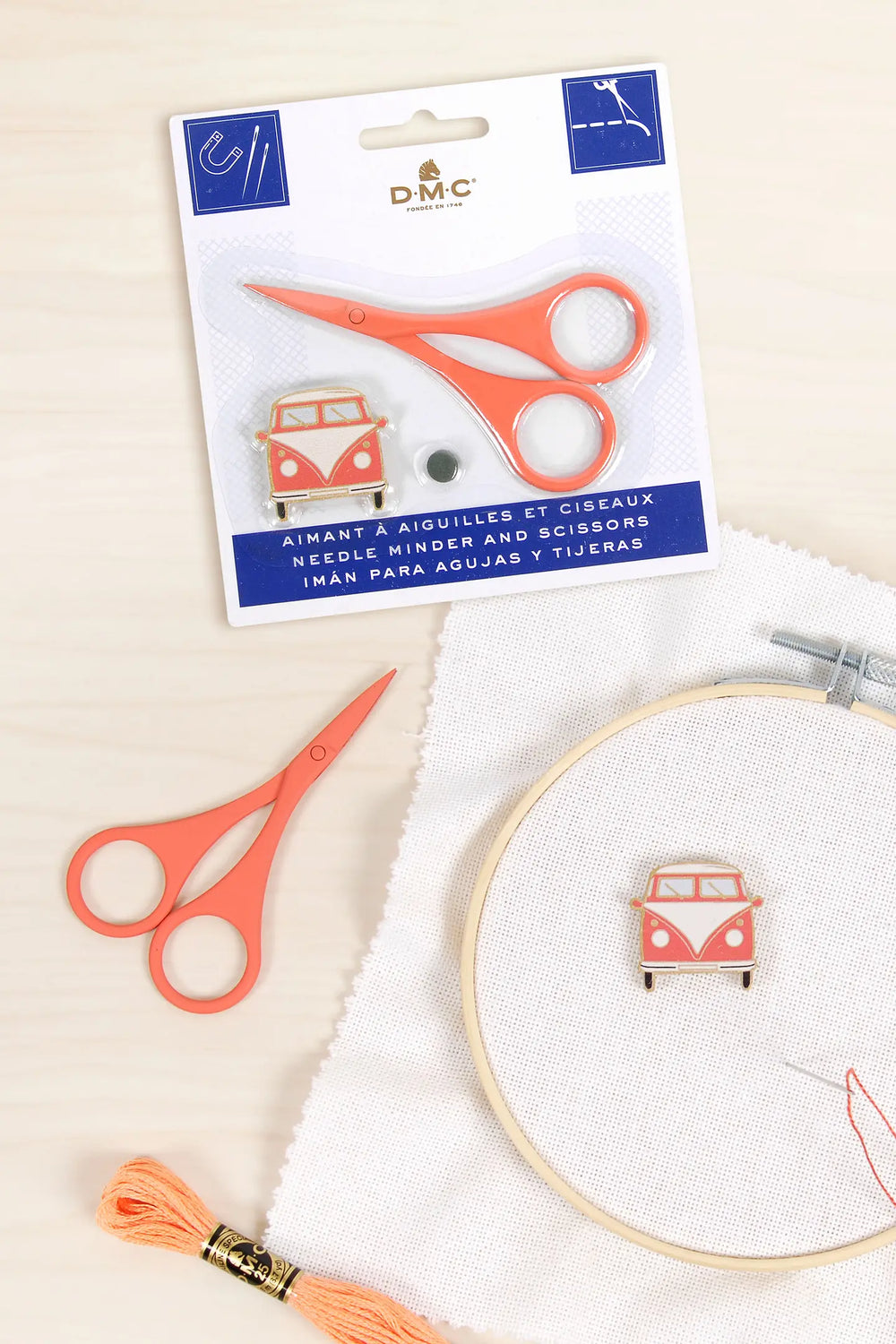 Añade estilo y funcionalidad a tu costurero con este encantador pack de DMC, que incluye unas elegantes tijeras de precisión color coral, negro y verde, un imán para agujas con diseño de furgoneta camper vintage.