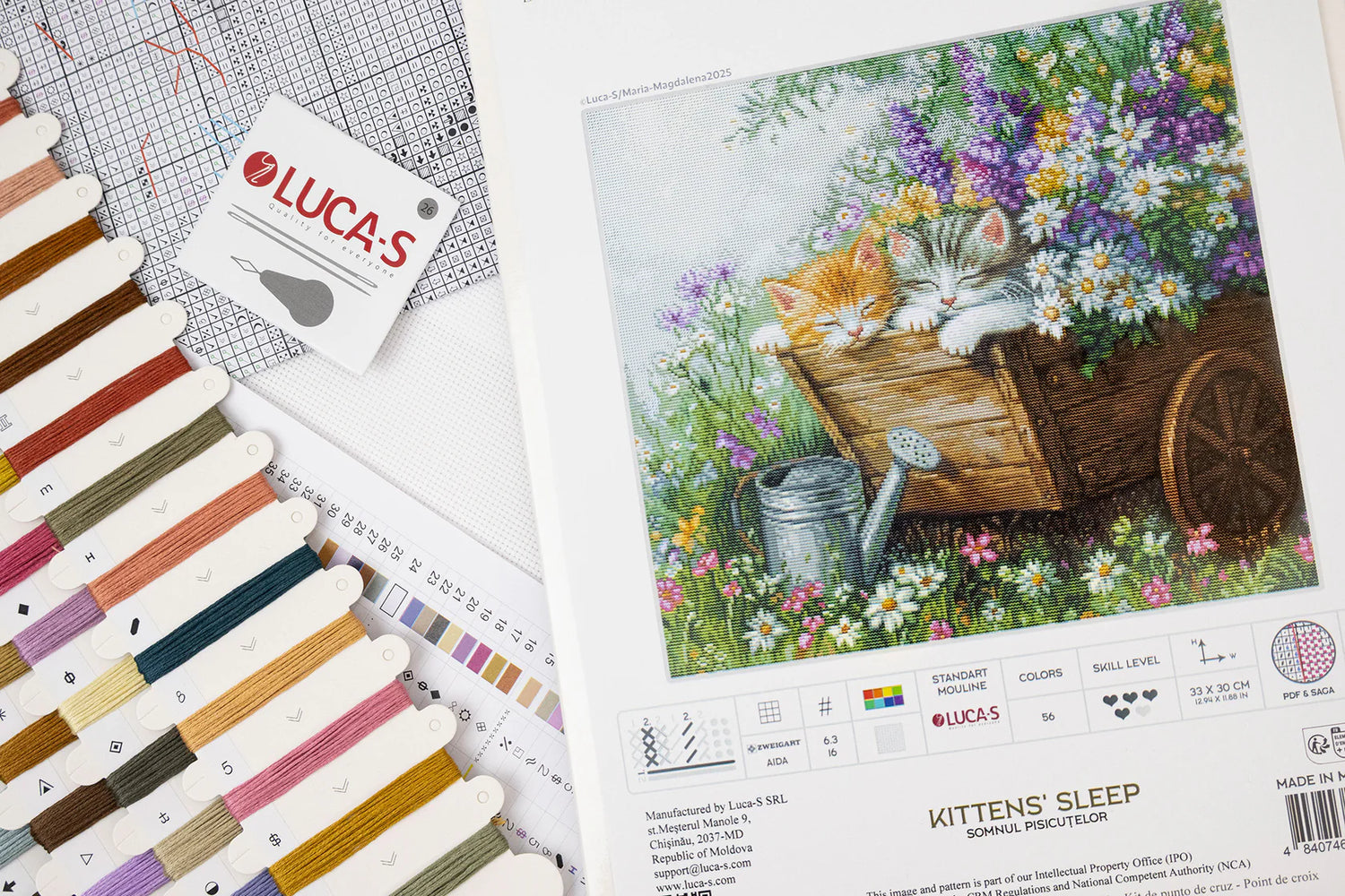 El kit de punto de cruz Kittens' Sleep de Luca-S (BU5093) muestra una tierna escena de dos gatitos durmiendo plácidamente en una carretilla de madera rodeada de flores silvestres. Un diseño encantador, lleno de color y dulzura, perfecto para los amantes de los animales y de los bordados con temática campestre.