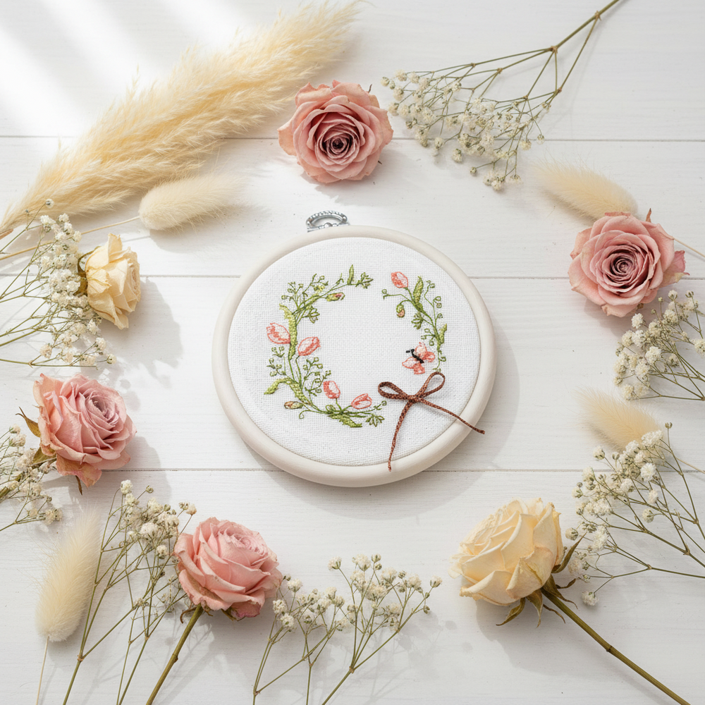 Una característica especial de este kit es que incluye un bastidor de bordado Nurge redondo (135 mm) en color blanco, que permite trabajar cómodamente y también utilizarlo como marco decorativo para colgar el bordado terminado.