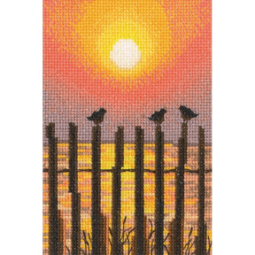El kit de punto de cruz contado "Siluetas al Atardecer" captura la belleza de una escena minimalista y serena, donde las siluetas de los pájaros descansan sobre una cerca, mientras el sol se pone en el horizonte. Ideal para aquellos que buscan bordar una obra sencilla pero llena de significado.