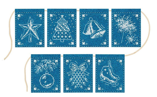 El kit de bordado MP Studia ST-1001 – “Guirnalda Milagro de Encaje” es una delicada decoración navideña formada por siete banderines bordados sobre fieltro azul brillante con diseños invernales: una estrella, un árbol de Navidad, campanas, bengalas, un adorno, un lazo y unos patines. Perfecta para adornar el hogar durante las fiestas, el árbol o una repisa.