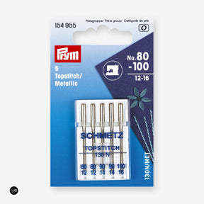 Pack of 5 universal needles for sewing machines with a flat trunk, specially designed for border sewing and decorative topstitching with effect threads and embroidery with metallic thread. Includes 2 80 mm, 2 90 mm and 1 100 mm needles from the Prym brand. Improve your sewing project with Prym special needles for metallic threads.