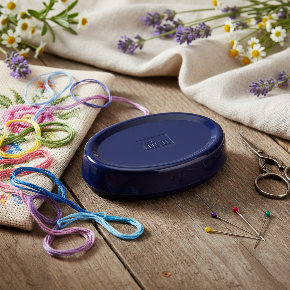 The Prym Magnetic Pin Mat is a handy tool for storing pins next to your sewing machine or sewing station. Featuring an oval design and a durable plum blue plastic casing, the needles are held in place by the strength of the magnet on the surface of the mat. It is also suitable for storing thumbtacks or staples. With dimensions of 7.5 cm x 11 cm , it is the perfect size for your needs.