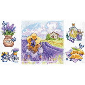 Andriana's "Provence Charm" cross-stitch kit captures the beauty and serenity of the Provence region. It features a central scene of a woman gazing into a lavender field, surrounded by classic Provence elements such as a jar of lavender, a decorated bicycle, and more.