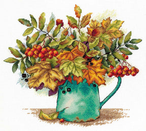 The "Scarlet Bunches of Rowan" cross-stitch kit by MP Studia features a charming composition of autumn leaves and scarlet bunches of rowan in a green jug. Ideal for capturing the essence of autumn in a piece of embroidery.