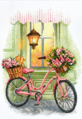 Add a touch of charm and romanticism to your home with the Cross Stitch Embroidery Kit "A Floral Trip" by Riolis 2089 . This beautiful design features a bicycle adorned with flowers in front of a cozy illuminated window, evoking a feeling of tranquility and beauty on a spring afternoon.