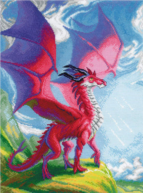 Discover the majesty of mythical creatures with the Cross Stitch Embroidery Kit "Your Mighty Dragon" by Riolis 2127 . This stunning design features a powerful red dragon with wings spread, standing out against a vibrant mountainous landscape and a bright blue sky.