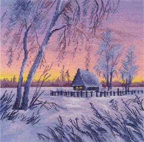 A cozy cabin nestled in the middle of a snowy landscape under a pink sunset sky. This design evokes tranquility and warmth on a cold winter evening. Ideal for those who love fairytale landscapes.