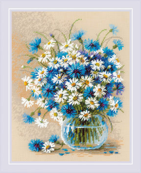 Create a charming bouquet with the "Daisies and Cornflowers" cross stitch kit Riolis 2249. This design shows a vibrant bouquet of daisies and cornflowers in a glass vase, full of freshness and elegance, ideal for those who love nature and floral motifs.