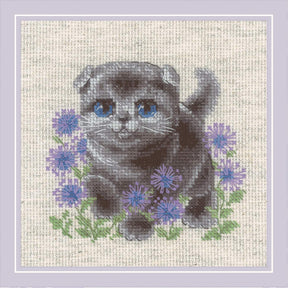 Fall in love with the tenderness of the Riolis 2120 Lop-eared Kitten Cross Stitch Kit . This adorable design features a lop-eared kitten with big blue eyes, surrounded by wildflowers in shades of purple, creating a charming and delicate scene.