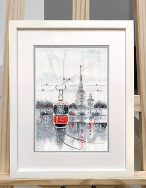 This cross stitch kit features a sleek, minimalist urban scene with a moving tram, capturing a modern architectural landscape.