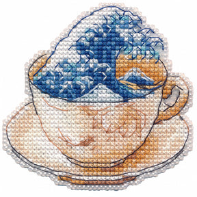 Create a beautiful and unique magnet with Oven's "Magnet. Wave" cross stitch kit. Inspired by the iconic artwork "The Great Wave off Kanagawa," this design features a majestic wave inside a teacup, merging the tranquility of art with everyday life.