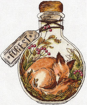 A cross stitch kit with a very creative and detailed design titled "Forest Dreams" SANL-23. In it you can see a sleeping fox inside a bottle, with a label that says "FOREST" and surrounded by botanical elements, which gives a feeling of encapsulated nature.