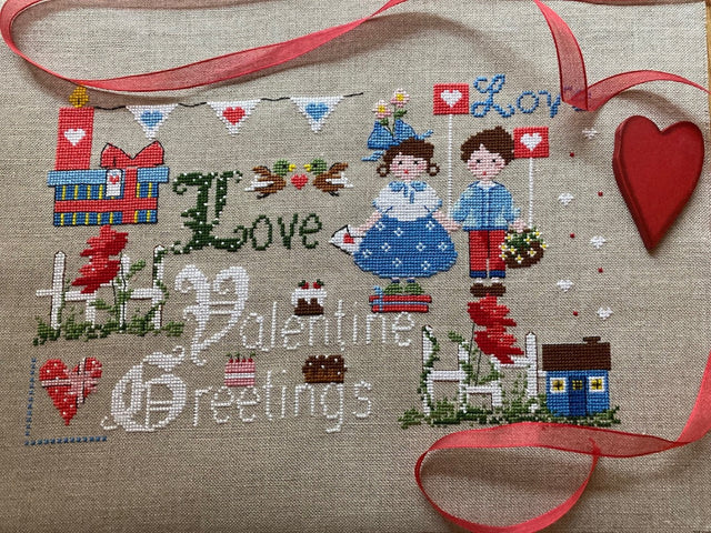 "Valentine's Day Greetings" is a counted cross stitch scheme with Valentine's Day motifs.