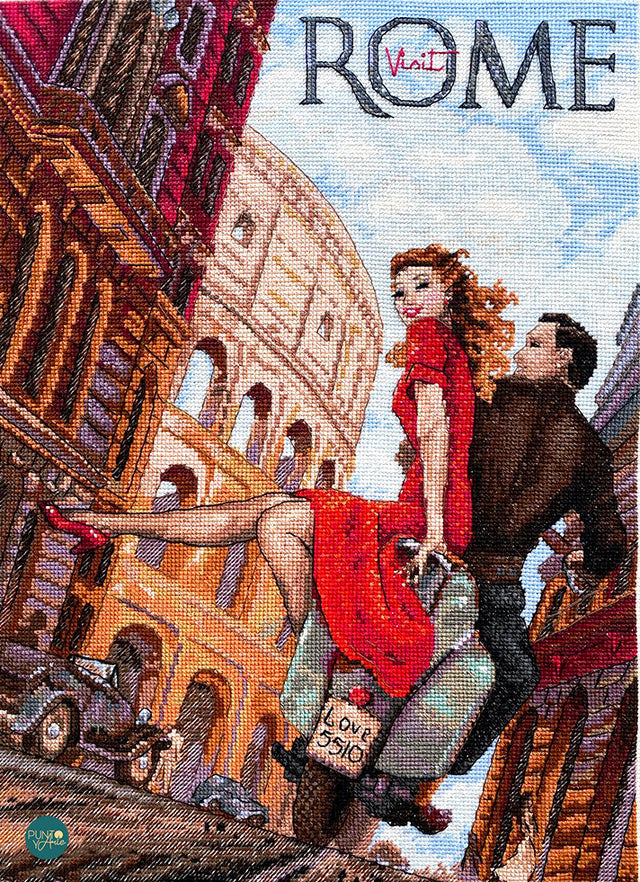 Live a love story in the Eternal City with the K-180 Visit Rome cross stitch kit by Merejka. Includes 16 count Aida fabric. Zweigart ecru color, 30 colors of 100% cotton Moulinè DMC threads, John James needle, color chart with romantic details and detailed instructions. Measurements 33x24.5 cm.