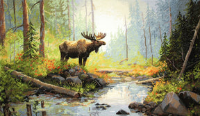 Discover the beauty of nature with the Merejka Cross Stitch Kit K-245 - Woodland Morning . This exquisite design features a serene morning woodland scene, featuring a majestic elk beside a stream, surrounded by vibrant flora and towering trees.