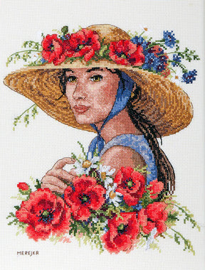 Introduce a touch of elegance to your home with Merejka's "Floral Hat" cross stitch kit. This charming design portrays a lady adorned with a hat decorated with vivacious red flowers, capturing an air of grace and natural beauty. Made with DMC threads and on ecru Aida 16 fabric, this kit is perfect for those who want to embroider a timeless and refined work of art.