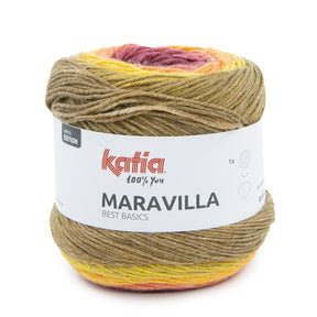 Katia Maravilla is a limited edition yarn that will surprise you with its incredible "Perfect Cycle" color gradient. Each 200 gram ball offers smooth and harmonious transitions, ideal for symmetrical color designs. With just one ball, you can knit a complete shawl and enjoy the magic of colors.