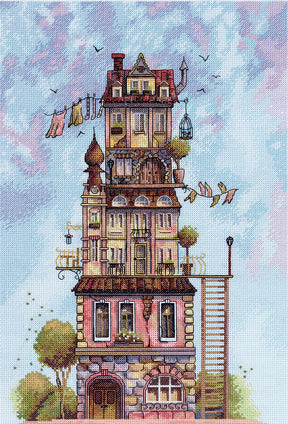 Let your imagination run wild with this charming cross-stitch design "The Wind Blows in the Attic" by PANNA. A poetic urban scene depicting a tall, fantastical house where the wind plays with the clothesline, trees, and birds.