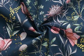 Environmentally friendly and skin-friendly, this fabric's Oeko-Tex Standard 100 certification ensures it is free of harmful substances, making it safe for all your sewing projects, from clothing to accessories and home decor. The floral print, with its color palette that includes hints of strong lychee, olive green, and fern green, contrasts harmoniously with the dark background, offering a contemporary and attractive interpretation of nature.
