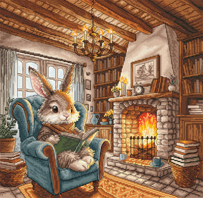 Immerse yourself in the calm of a cozy afternoon with AVA's "Afternoon of Reading" cross stitch kit . This charming design depicts an adorable bunny enjoying a good book by the warmth of the fireplace, surrounded by books and a peaceful, homey atmosphere.