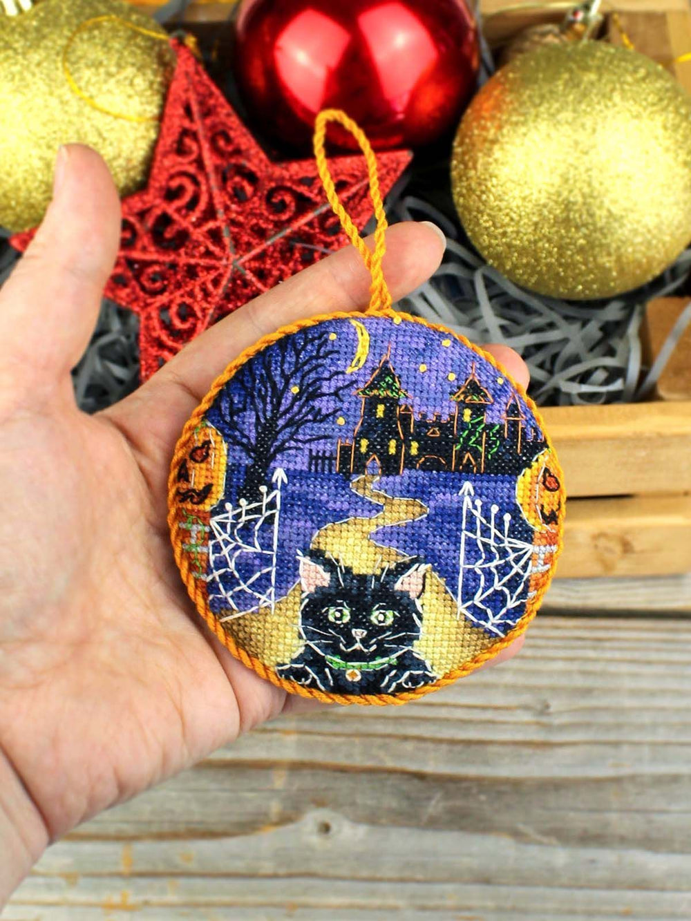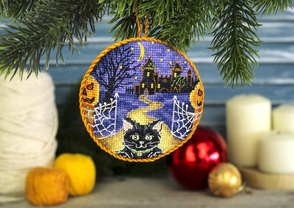 El kit de punto de cruz MP Studia SNV-906 – Halloween. Pinkeep es un pequeño y encantador adorno ideal para la temporada de Halloween. El diseño muestra un gatito negro con mirada brillante frente a un castillo embrujado, bajo la luz de la luna y rodeado de calabazas y telarañas. Perfecto para decorar tu hogar o crear un colgante artesanal con un toque misterioso y festivo.